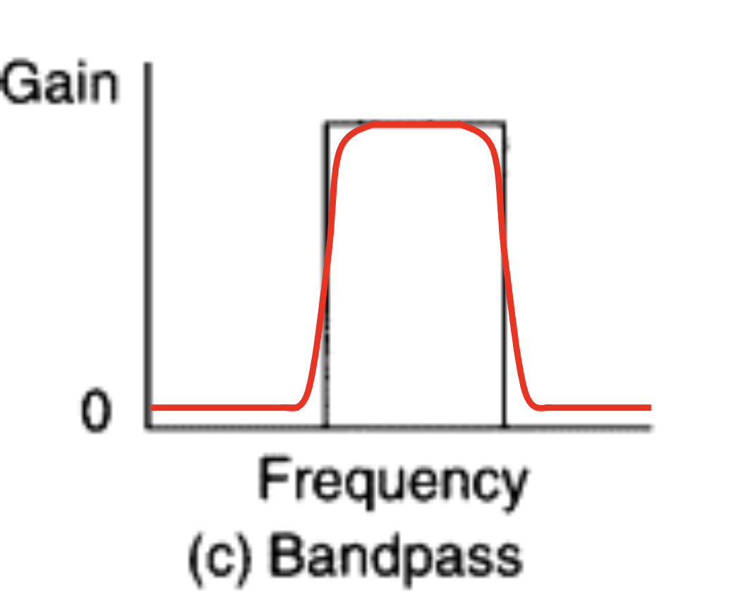 The ability for a filter begin acting within its cutoff frequency, or its quality, is measured by its Q factor. An example of a more realistic, imperfect filter is shown below.