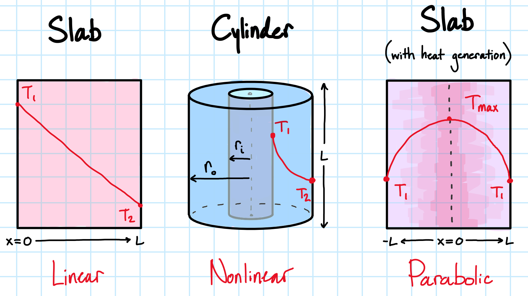 A slab has a linear temperature profile at steady-state. If the slab has a constant internal heat generation, it yields a parabolic temperature profile instead. Cylindrical and spherical geometries have nonlinear temperature profiles, as the cross-sectional area varies with position through the object.